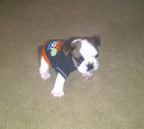 | Dexter's hobbled legs, to help him learn to stand. Look at that belleh! |
